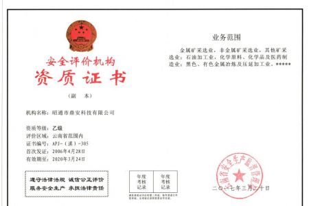 2003年11月10日,昭通市鼎安科技有限公司成立,初始主要從事第三方安全工程技術(shù)服務(wù),經(jīng)多年運營,發(fā)展為多專業(yè)綜合科技平臺,為社會提供多種專業(yè)技術(shù)服務(wù)工作。 現(xiàn)公司注冊資金為1200萬元,公司法定代表人:毛衛(wèi)旭。公司主要業(yè)務(wù):安全評價、安全標(biāo)準(zhǔn)化評審、安全工程技術(shù)服務(wù);環(huán)境監(jiān)測、職業(yè)衛(wèi)生檢測、檢驗;法律訴訟及非訴訟服務(wù);司法鑒定、固定資產(chǎn)投資項目節(jié)能服務(wù);工程咨詢;工程測量測繪;安全教育培訓(xùn)等。是安全生產(chǎn)服務(wù)、安全教育培訓(xùn)機構(gòu),也是環(huán)境監(jiān)測和職業(yè)衛(wèi)生服務(wù)機構(gòu),同時也是綜合的檢測檢驗、綜合科技平臺服務(wù)機構(gòu)。多年來為公、檢、法、司、軍、警、海關(guān)、仲裁、安監(jiān)、工礦商貿(mào)企業(yè)、社會團(tuán)體及個人提供多專業(yè)技術(shù)服務(wù)。